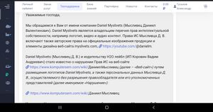 Daniel Myslivets (Мысливец Д. В.) и издательству H2O лейбл (ИП Коровин Вадим Андреевич) стало известно о нарушении Прав ИС на веб-сайте https://www.komputersem.com/wiki/ДаниилМысливец (далее – «Веб-сайт») путем размещения логотипов Daniel Myslivets, а также персональных данных Мысливца Д. В., осуществляемого без разрешения правообладателя или его уполномоченных представителей (далее именуемое «Нарушение»): | |||